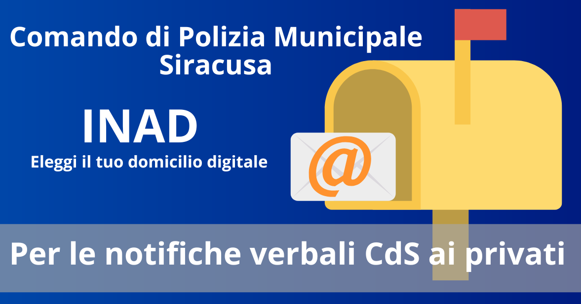 Il Comando di Polizia Municipale di Siracusa informa che i cittadini che hanno registrato il proprio domicilio digitale sull’Indice Nazionale dei Domicili Digitali (INAD) potranno ricevere tramite Posta Elettronica Certificata (PEC) le notifiche relative agli accertamenti delle violazioni amministrative in materia di Codice della Strada.