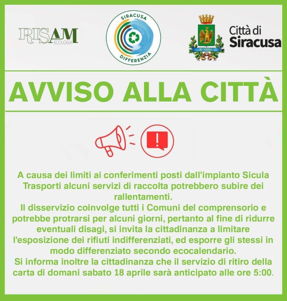 A causa dei limiti ai conferimenti posti dall'impianto Sicula Trasporti alcuni servizi di raccolta potrebbero subire dei rallentamenti. Al fine di ridurre eventuali disagi, si invita la cittadinanza a limitare l'esposizione dei rifiuti indifferenziati...