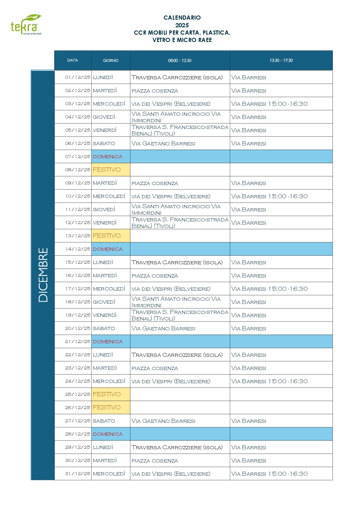 Calendario CCR mobili per carta, plastica, vetro e micro raee Dicembre 2025