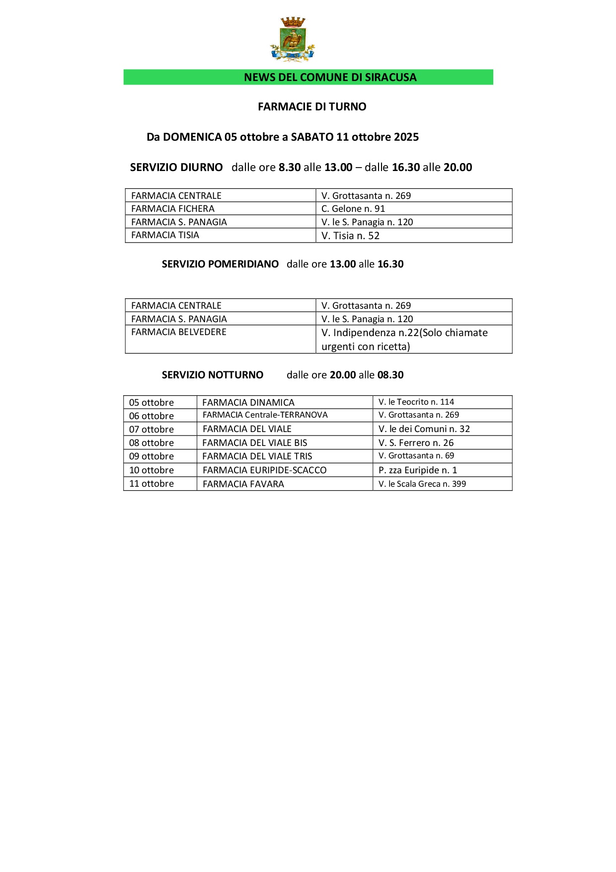 Turni settimanali da Domenica 05 Ottobre a Sabato 11 Ottobre 2025