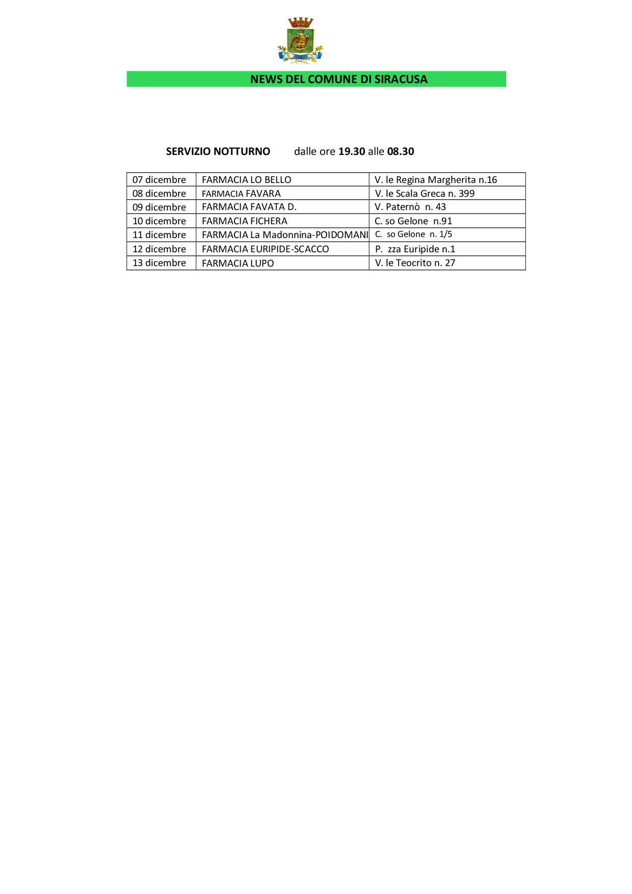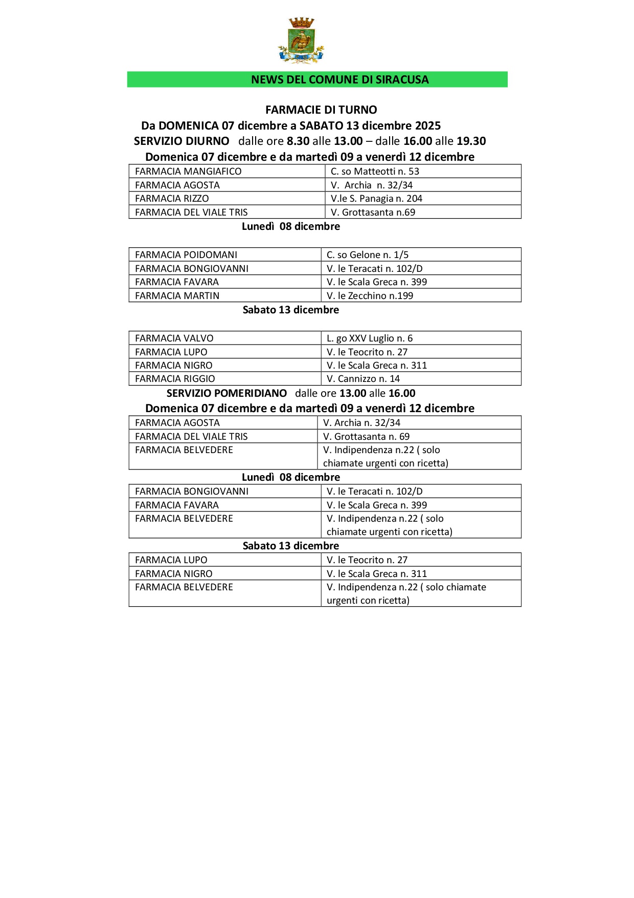 Turni settimanali da Domenica 07 dicembre a sabato 13 dicembre 2025