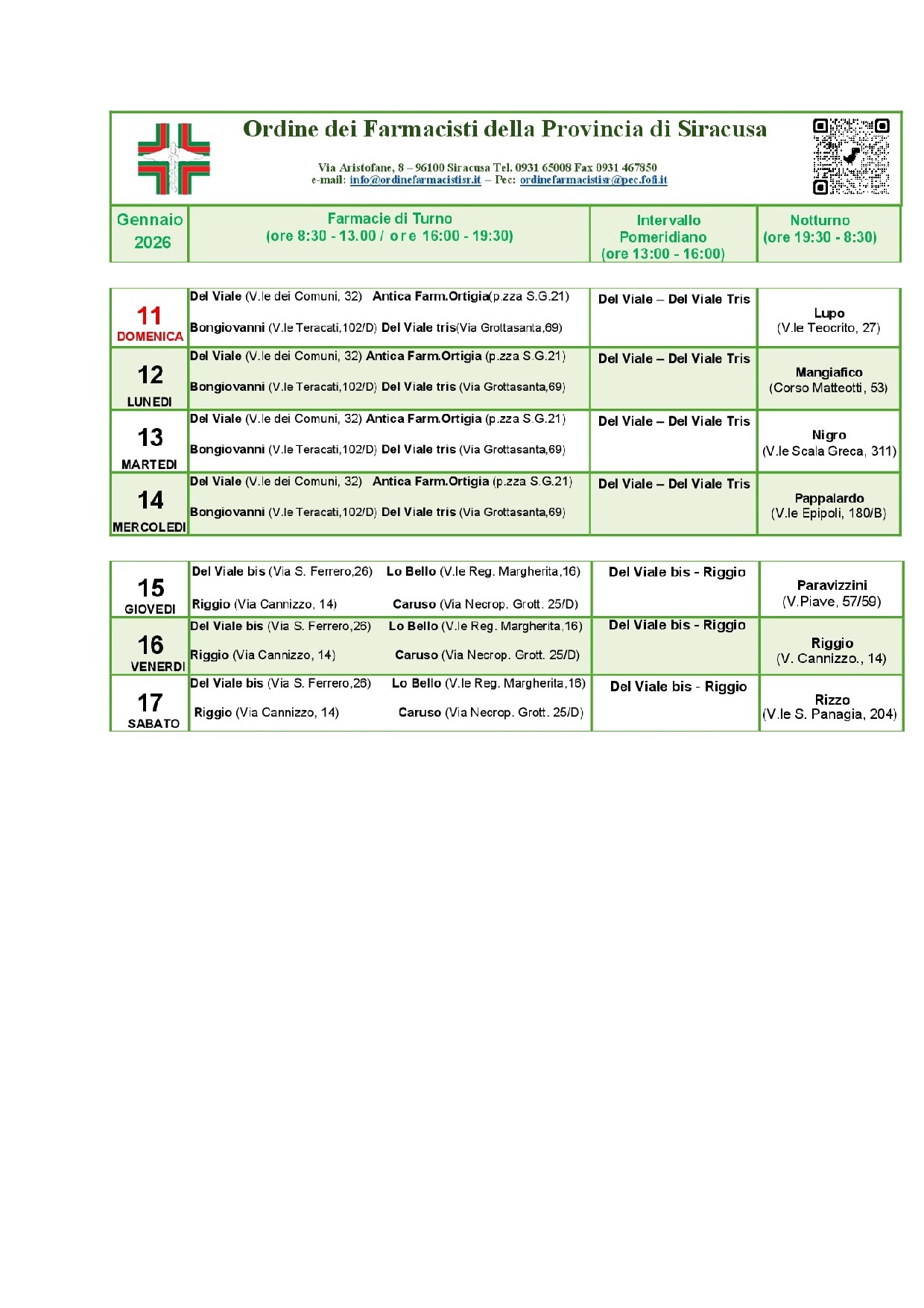 Turni settimanali da Domenica 11 Gennaio a Sabato 17 Gennaio 2026