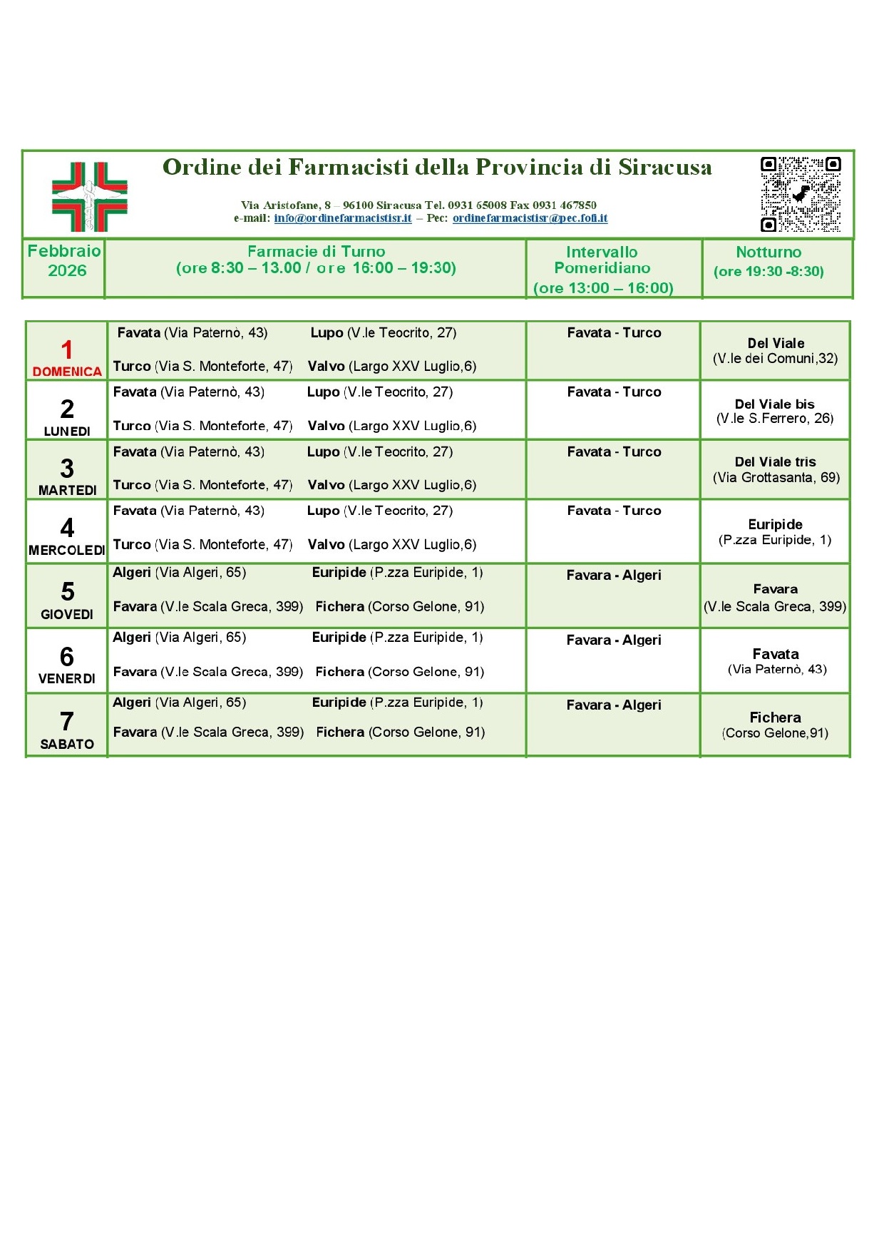 Turni settimanali da Domenica 01 Febbraio a Sabato 07 Febbraio 2026