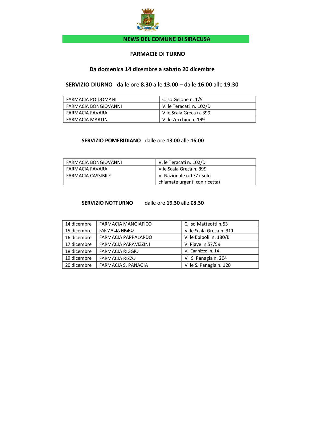 Turni settimanali da domenica 14 dicembre a sabato 20 dicembre 2025