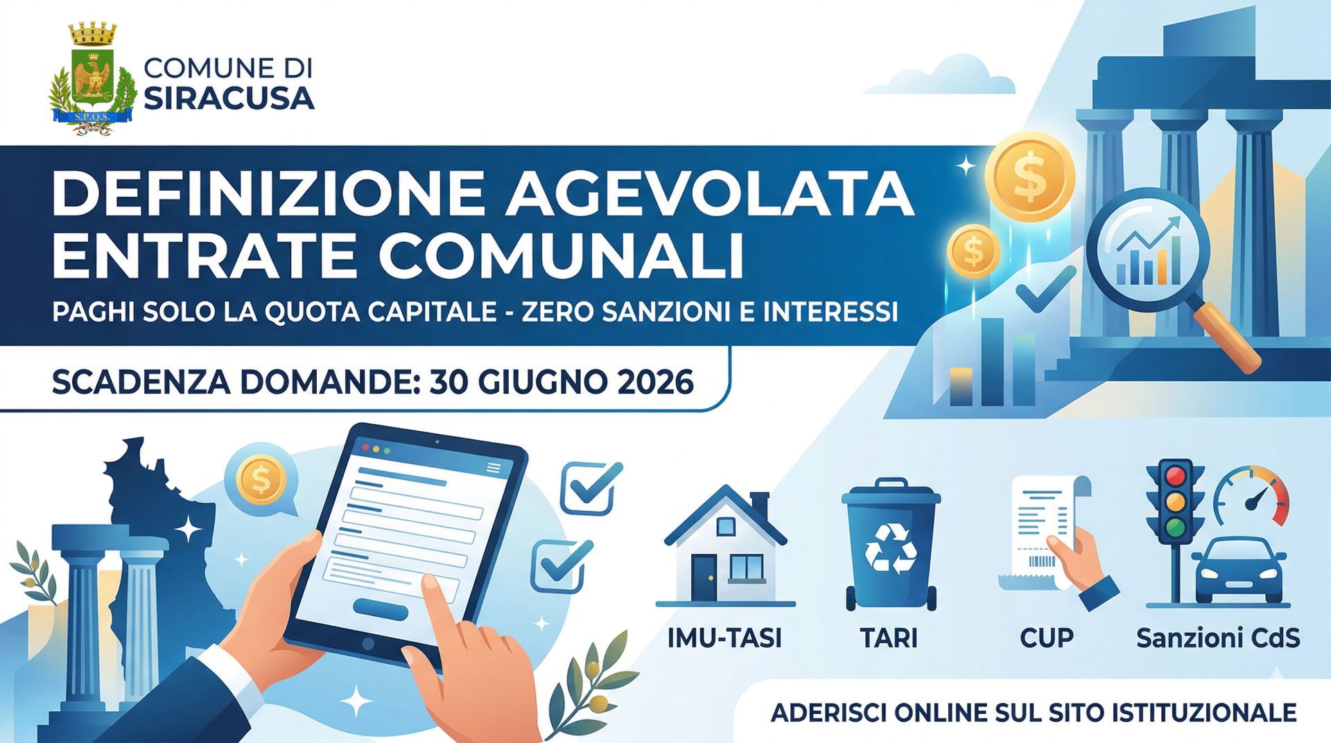 Il Comune di Siracusa informa la cittadinanza che, in esecuzione della deliberazione di Consiglio Comunale n. 53 del 17/03/2026, è attivo il servizio per la definizione agevolata delle entrate comunali. Questa misura permette ai contribuenti di regolarizzare la propria posizione debitoria relativa a tributi locali e sanzioni del Codice della Strada, beneficiando dell'abbattimento di sanzioni e interessi.