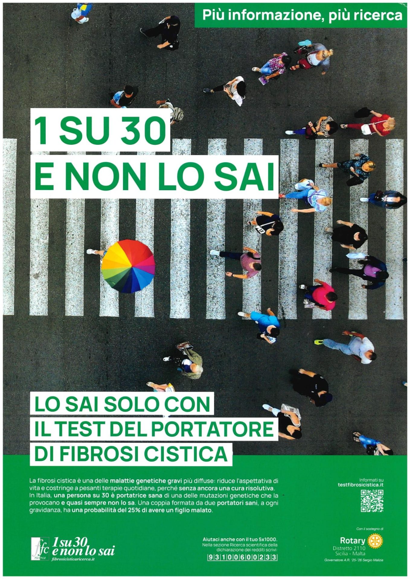 Nome dell’iniziativa è "Accendiamo la Sicilia", per richiamare l’attenzione sulla patologia e lanciare alla popolazione un messaggio semplice: 1 su trenta di noi non sa di essere portatore sano, asintomatico e inconsapevole di una mutazione genetica sul gene CFTR che può trasmettere ai figli.