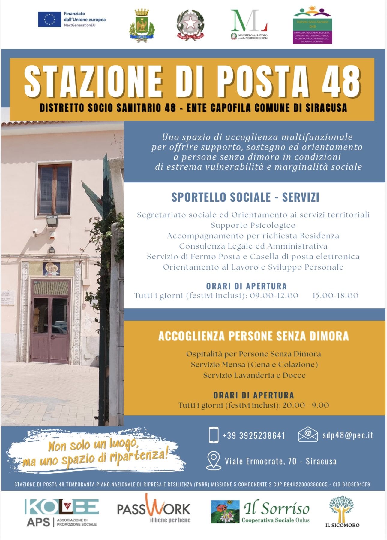 Dalla prossima settimana sarà pienamente operativo il progetto “Stazione di Posta 48”, promosso dal Distretto Socio Sanitario 48, di cui il Comune di Siracusa è ente capofila, e finanziato con i fondi del Piano Nazionale di Ripresa e Resilienza (PNRR – Missione 5, Componente 2).