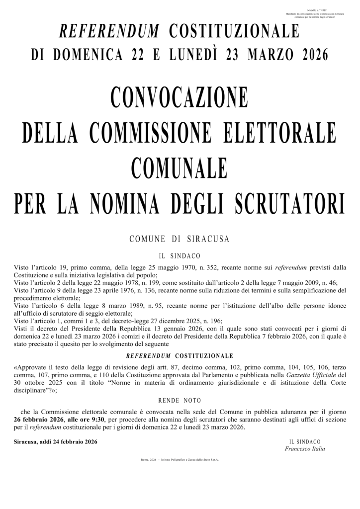 Referendum 2026, convocazione della commissione elettorale comunale per la nomina degli scrutatori