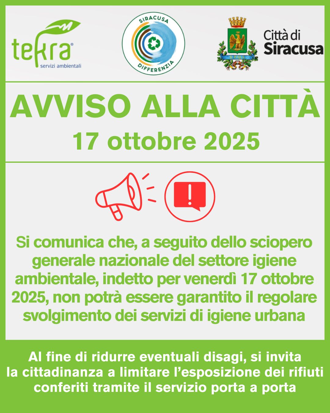 Il Comune di Siracusa informa la cittadinanza che, a causa dello sciopero generale nazionale indetto per il settore igiene ambientale venerdì 17 ottobre 2025, il regolare svolgimento dei servizi di raccolta e igiene urbana potrebbe subire rallentamenti o sospensioni in città.