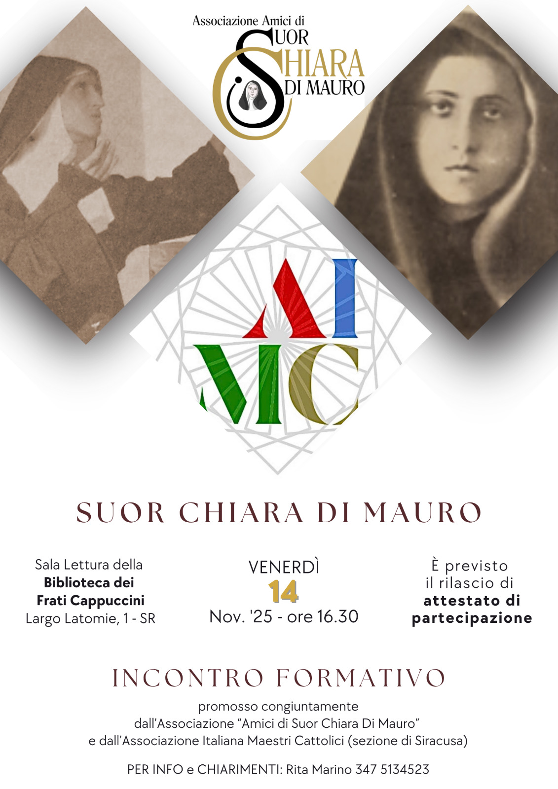L’Associazione “Amici di Suor Chiara Di Mauro” in collaborazione con l'Associazione Italiana Maestri Cattolici (AIMC) sez. di Siracusa organizzano un incontro formativo e didattico, rivolto in special modo ai docenti della città aretusea, sulla figura di Suor Chiara Di Mauro, che si terrà venerdì 14 novembre alle ore 16:30 nella sala di lettura della Biblioteca dei PP. Cappuccini di Siracusa (Largo Latomie, 1).