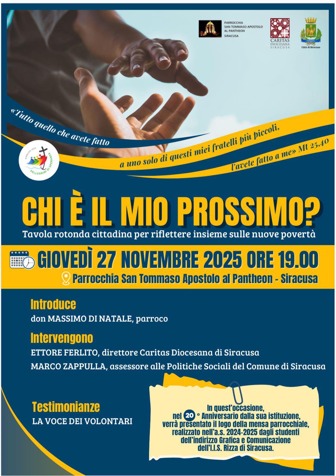 Nel novero delle attività celebrative e riferite al 20esimo Anniversario della Mensa dei Poveri della Parrocchia San Tommaso Apostolo al Pantheon - Siracusa, desideriamo comunicarvi che Giovedì 27 Novembre 2025 p.v., a partire dalle ore 19:00, presso la Chiesa del Pantheon, avrà luogo l’evento “Chi è il mio prossimo?”, tavola rotonda cittadina alla quale interverranno il direttore della Caritas Diocesana di Siracusa, Diac. Ettore Ferlito, l’Assessore alle Politiche Sociali dott. Marco Zappulla, il parroco Don Massimo Di Natale ed i volontari impegnati nelle attività e nei servizi di riferimento, con l’obiettivo di riflettere insieme sull’importantissimo tema delle nuove, attuali povertà. Tutta la comunità diocesana è invitata a partecipare