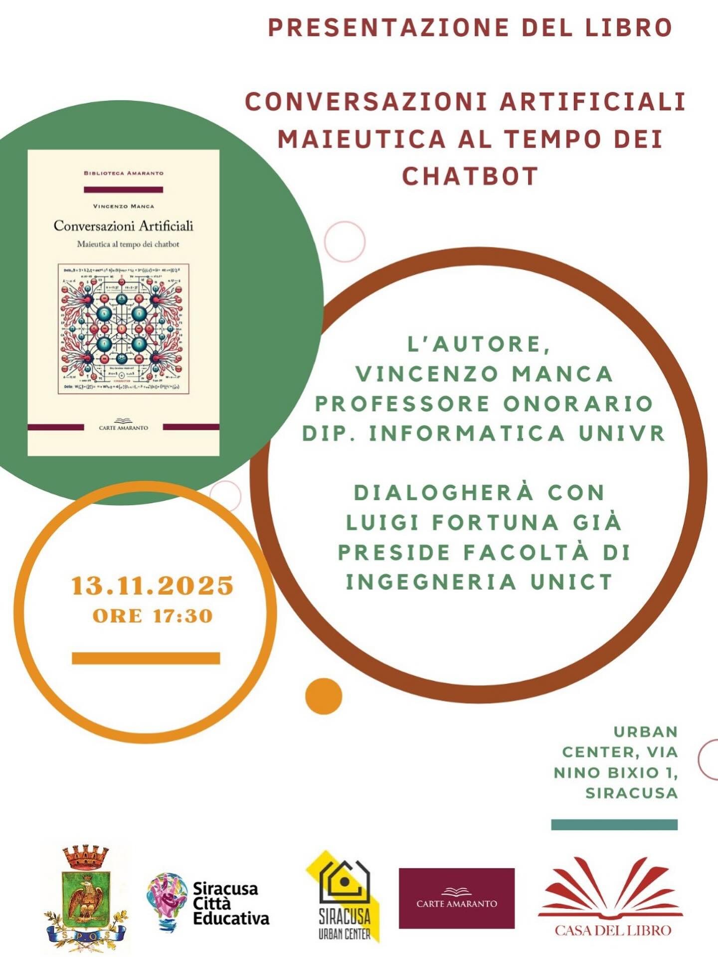 Vincenzo Manca è docente di informatica all’Università di Verona. I suoi interessi di ricerca spaziano dalla logica matematica e informatica teorica alla genomica computazionale e al calcolo naturale. Giovedì 13 novembre ci parlerà dell’uso possibile delle conversazioni artificiali con la tecnologia chatbot .