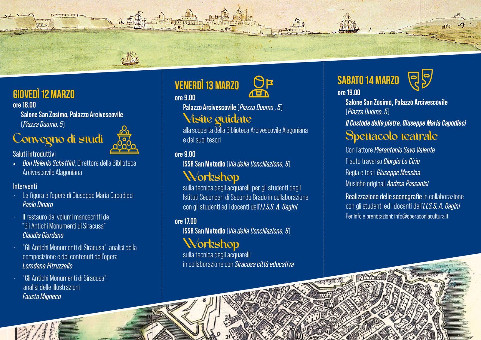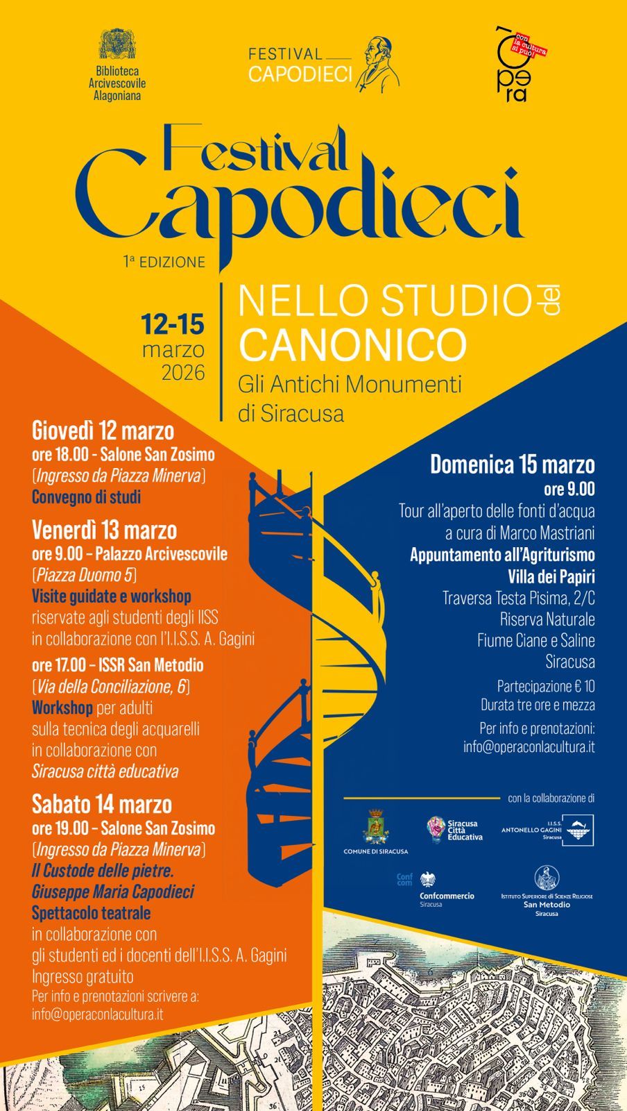 "Quattro giorni ricchi di appuntamenti rivolti anche alle scuole e ai giovani - ha spiegato don Helenio Schettini, direttore della Biblioteca Alagoniana -. Collaboreranno ad alcuni momenti del Festival anche i docenti e gli studenti del Liceo Artistico A. Gagini. Si tratta di un festival che vuole omaggiare la figura di Monsignor Giuseppe Maria Capodieci che tra la fine del Settecento e i primi dell'Ottocento ha realizzato una collezione di 54 volumi, vere e proprie testimonianze dirette della città di Siracusa dell’epoca. Volumi che narrano vari aspetti della nostra città, dalla sua storia, ai suoi luoghi, alle sue famiglie, alle iscrizioni che si trovano nella città, davvero tanti aspetti: un patrimonio che possa diventare di tutti. Il Festival intende celebrare il restauro di due volumi dal titolo Gli Antichi Monumenti di Siracusa. Un’occasione unica che permetterà ai partecipanti di poter assistere alle riprese inedite del processo di restauro dei volumi, ma anche di poter andare alla scoperta della Biblioteca Arcivescovile Alagoniana. Abbiamo pensato ad un ciclo di incontri che potesse guidare i partecipanti attraverso una conoscenza più approfondita della poliedrica e significativa figura di Capodieci".