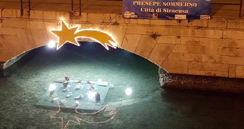 Il presepe subacqueo che si trova nell’area del porto piccolo, a ridosso del Ponte umbertino, l’ingresso del centro storico della città. Si tratta di una iniziativa, chiamata “Presepe Sommerso Città di Siracusa”, organizzata dalla R.O.S.S. Protezione Civile.