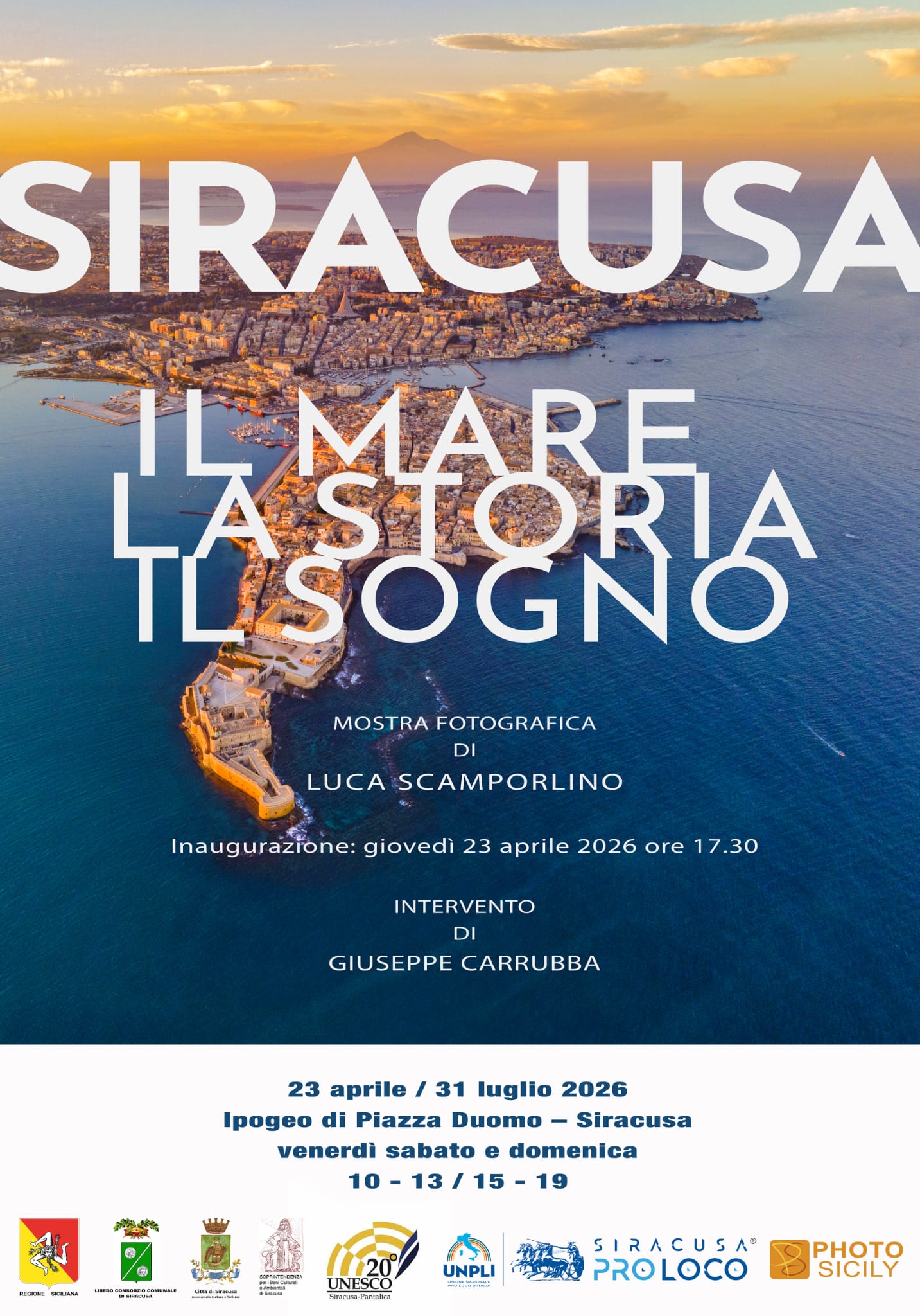 Dal 23 aprile al 31 luglio 2026 l’IPOGEO di Piazza Duomo a Siracusa ospita la mostra fotografica “Siracusa: il Mare, la Storia, il Sogno”, organizzata dalla Pro Loco, promossa dal Comune di Siracusa, Settore Cultura e Turismo, dalla Soprintendenza.